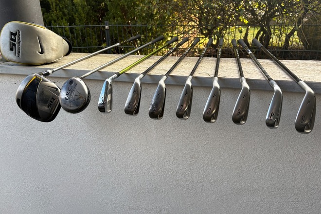 Nike Driver SQ HL (fehlerverzeihend), 5er Callaway Holz, 3er Eisen. Schlagweiten sind ok. 7er Eisen 130m. Das PW ist von Callaway mit Stahlschaft.